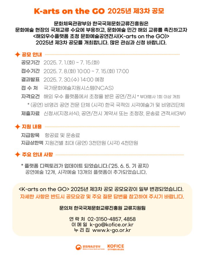 <해외우수플랫폼 초청 문화예술공연전시 지원(K-arts on the GO)> 2025년 제3차 공모 개최