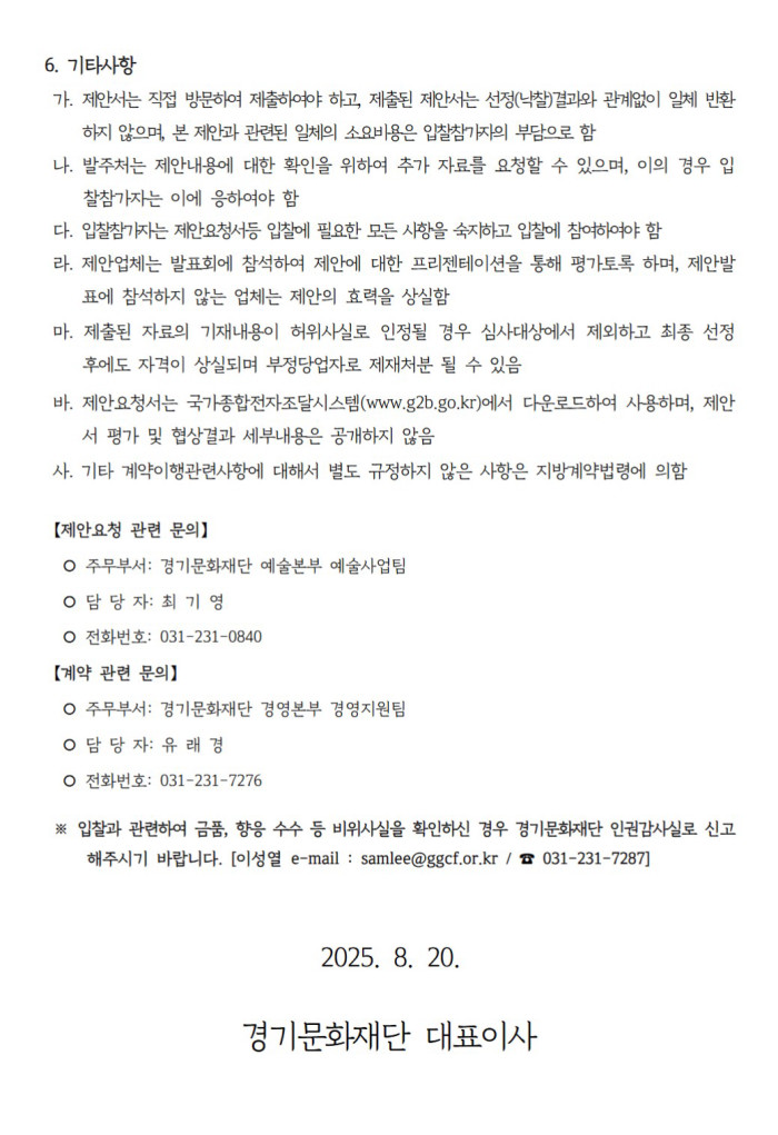 2. 경기문화재단의 고지가 있고 난 뒤 효력 발생일까지 어떠한 이의도 제기하지 않았을 경우, 개정된 가이드를 승인한 것으로 간주합니다.