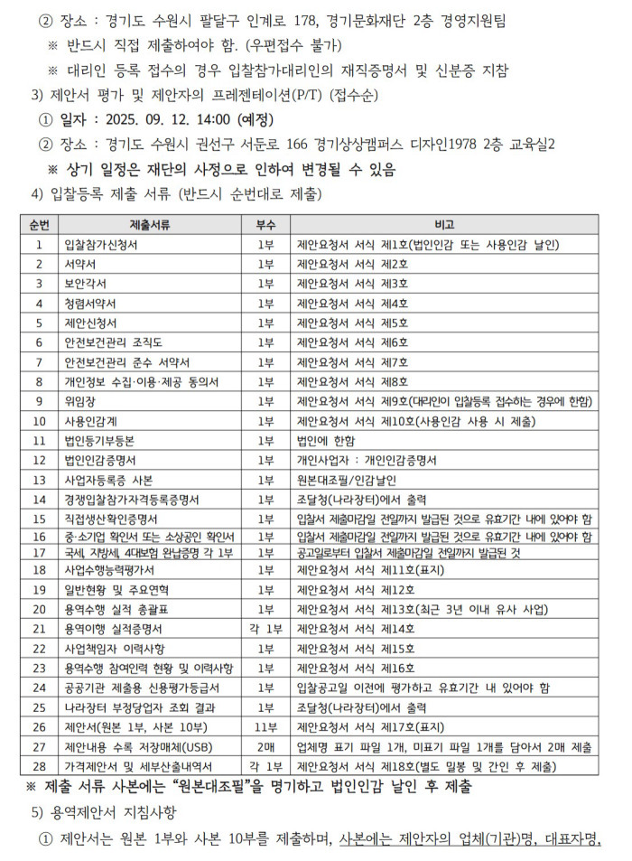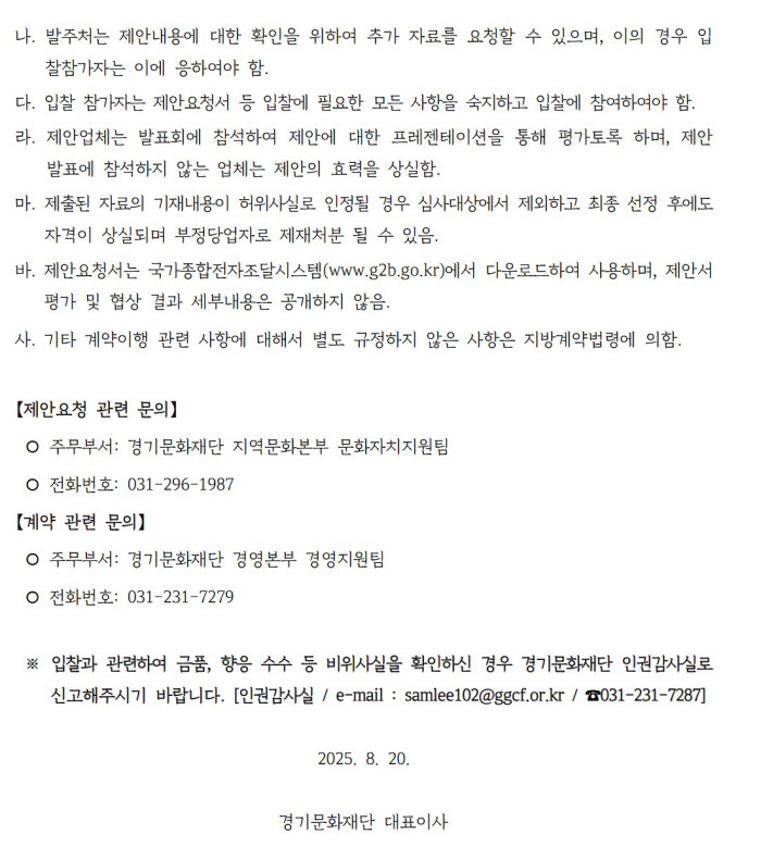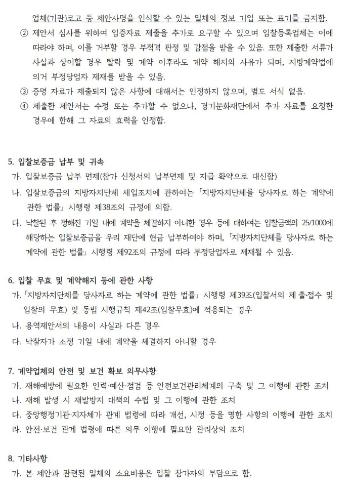 2. 경기문화재단의 고지가 있고 난 뒤 효력 발생일까지 어떠한 이의도 제기하지 않았을 경우, 개정된 가이드를 승인한 것으로 간주합니다.