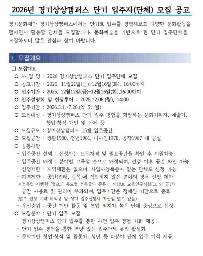 2026년 경기상상캠퍼스 단기 입주자(단체) 모집 공고
