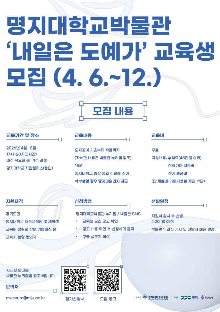 [명지대학교박물관] '내일은 도예가' 참가자 모집 (4/6~4/12)
