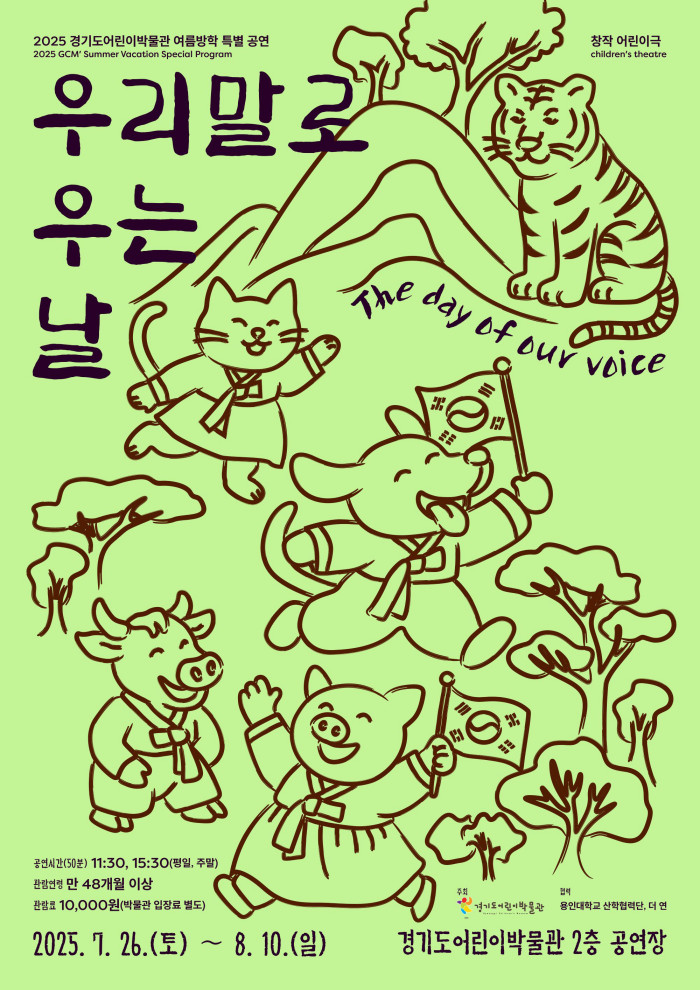 경기문화재단 경기도어린이박물관은 여름방학을 맞아 관람객들을 위한 창작 어린이극 ‘우리말로 우는 날’을 무대에 올린다. 이번 공연은 작년에 이어 두 번째로 선보이는 창작 어린이극으로, 올해에는 광복 80주년을 기념하여 ‘독립’을 주제로 용인대학교 산학협력단, 극단 더 연과 협력하여 무대에 올린다.