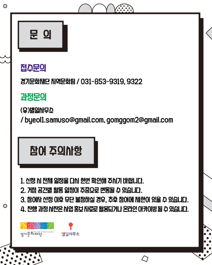 ② 본 가이드는 경기문화재단의 온라인 플랫폼 운영 정책 및 저작권 등 관련 법규에 따라 개정될 수 있으며, 가이드를 개정, 적용하고자 할 때는 30일 이전에 약관 개정 내용, 사유 등을 '회원'에 전자우편으로 발송, 공지합니다. 단, 법령의 개정 등으로 긴급하게 가이드를 변경할 경우, 효력 발생일 직전에 동일한 방법으로 알려 드립니다.