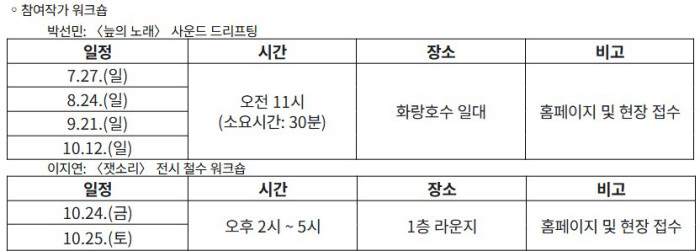 ※ 전시해설(도슨트) 프로그램 및 다양한 전시 연계 이벤트와 프로그램 등 자세한 사항은 전시 기간 중 경기도미술관 공식 누리집(https://gmoma.ggcf.kr)을 통해 확인 할 수 있다.