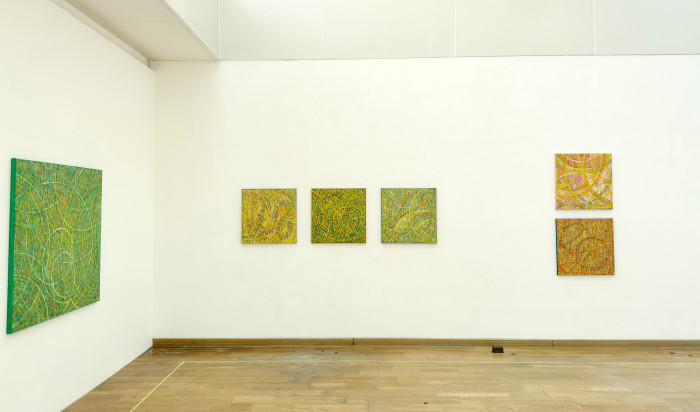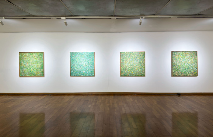 이번 전시 《뉴 심포니: 텅 빈 충만》은 오랜 탐구와 내면 수행의 결실이다. '심포니'라는 제목은 작품들이 만들어내는 리듬과 조화를 음악에 비유한 것이다. 작가는 팔레트 나이프를 이용해 점과 선을 겹쳐 물성이 쌓인 화면을 구축하며, 반복적 행위를 통해 명상적이면서도 생동감 있는 리듬을 형성한다. 겹침과 해체, 재구성으로 완성된 화면은 내면의 에너지와 조화로운 질서를 담아낸다. 이는 다양한 요소가 어우러져 이루어진 시각적 교향곡이라 할 수 있다.