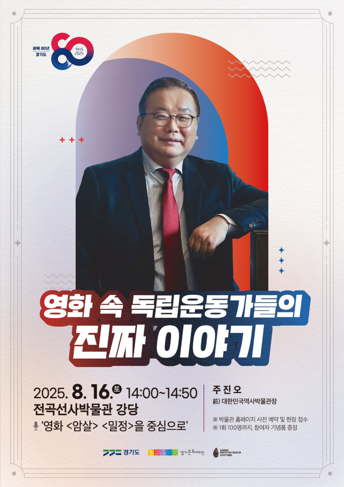 8월 16일(토) 오후 2시, 전곡선사박물관 강당에서는 주진오 前)대한민국역사박물관장의 ‘영화 속 독립운동가들의 진짜 이야기’를 주제로 강연한다. 암살, 밀정 등 대중적으로 사랑받은 작품 속 실제 인물들의 이야기와 시대를 생생히 전하며, 강연 전후로 두 영화가 상영되어 영상과 역사를 함께 즐길 수 있다. 영화와 강연은 박물관 홈페이지 사전 예약 또는 현장 접수로 참여 가능하며, 회차별 선착순 100명을 받는다.