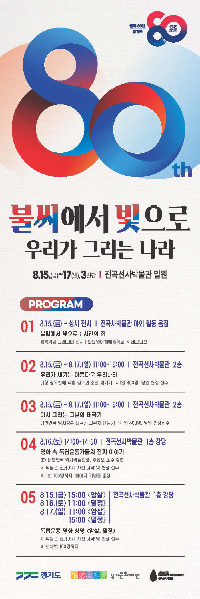 경기문화재단 전곡선사박물관(관장 이한용)이 오는 8월 15일부터 17일까지 광복 80주년을 기념하는 의미 있는 예술·참여 프로그램 ‘불씨에서 빛으로 : 우리가 그리는 나라’를 선보인다. 이번 행사는 선사시대에서 광복, 현대, 그리고 미래로 이어지는 시간의 흐름을 예술로 풀어내고, 관람객이 직접 참여해 완성하는 프로그램이 다채롭게 벌어진다.