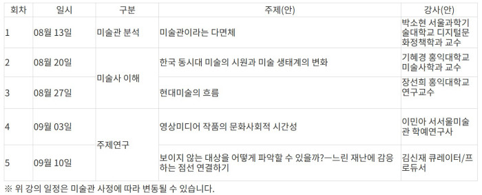 올해는 ▲‘미술관이라는 다면체’(박소현, 서울과학기술대), ▲‘한국 동시대 미술의 시원과 미술 생태계의 변화’(기혜경, 홍익대), ▲‘현대미술의 흐름’(장선희, 홍익대), ▲‘영상미디어작품의 문화사회적 시간성’(이민아, 서서울미술관), ▲‘보이지 않는 대상을 어떻게 파악할 수 있을까-느린 재난에 감응하는 점선 연결하기’(김신재, 독립 큐레이터)의 주제를 다룬다.