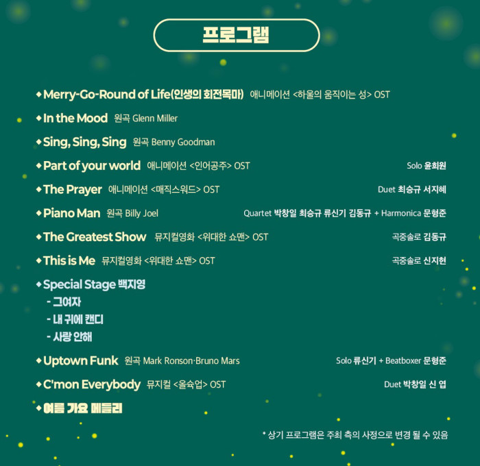 이번 공연에서는 수원시립합창단 김보미 예술감독의 지휘 아래 수원시립합창단과 프로젝트 팝스 앙상블의 웅장하고 환상적인 라이브 연주로 우리 귀에 익숙한 팝송, 주옥같은 영화와 애니메이션 OST, 뮤지컬 명곡, 가요 등 다채로운 음악들을 들려줄 예정이며 친숙한 해설, 화려한 조명과 영상이 더해져 더욱 생동감 넘치는 무대가 펼쳐질 예정이다.