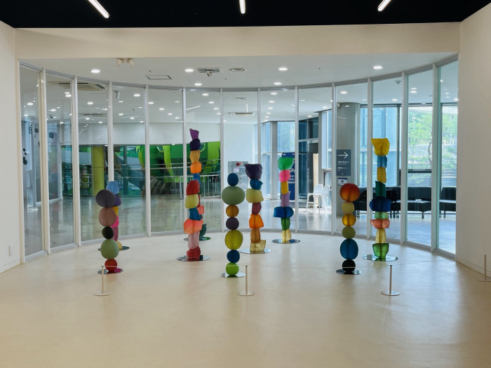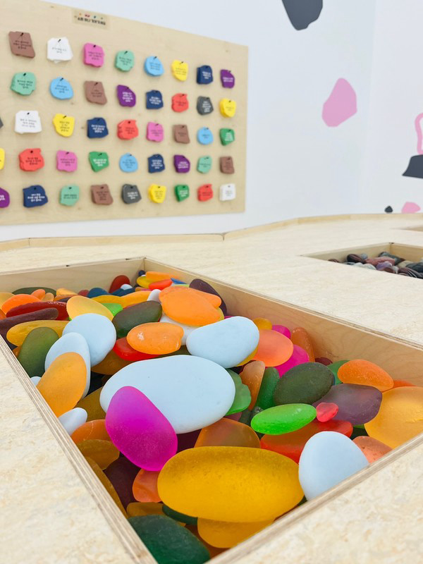 [인터뷰 / 참여작가 진귀원] “이번에 출품한 작품은 <돌 쌓기>라는 순수하고 원초적인 행위를 주제로 만들어진 작품인데요. <돌 쌓기>는 인류 최초의 예술이자 인간의 의지를 담는 행위라고 합니다. 저는 산이나 강가에서 흔하게 굴러다니는 돌을 주워다가 캐스팅해서 레진이라는 투명한 재료로 돌을 만들어서 내는데, 흔한 돌이 귀한 보석처럼 변하는 극적인 변화를 보여줘서 실제 작품들은 거대한 보석을 쌓아 올린 것처럼 보입니다. 우리가 접하는 보석이라는 게 아주 작은 사이즈들이잖아요. 일상적이지 않은 장면을 대면하는 것이 관람객에게 또 다른 즐거움을 주었으면 좋겠습니다. 이번 전시에 어린이들이 투명하고 알록달록한 자갈을 쌓는 체험을 할 수 있는 작품을 제작했는데요. 돌을 쌓는다는 것이 돌의 의지를 담는 행위이고, 이것을 통해 자연과 교감을 할 수 있었으면 좋겠고, 작은 자갈들을 직접 쌓아 올리는 체험을 통해 균형과 조화를 탐구하고 성취감을 느끼고 가는 전시가 되었으면 좋겠습니다.”