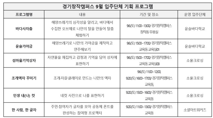 9월에 진행되는 〈입주단체 기획 프로그램〉은 문화예술에 대한 흥미를 넓히고, 환경과 지역사회를 함께 고민할 수 있도록 기획되었다. 체험료는 무료에서 5천 원까지 다양하며, 프로그램은 사전 예약제로 운영된다. 참여 신청과 자세한 정보는 경기창작캠퍼스 누리집(gcc.ggcf.kr/) 에서 확인할 수 있다.