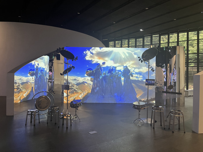 ◇ 이실아 : 네, 특히 염인화 작가의 <솔라소닉 밴드>는 관람객이 직접 참여할 수 있는 작품인데요. 가상현실로 구현된 무대 속에서 인공지능 멤버들이 기후 위기의 시대를 배경으로 연주합니다. 관객은 증강현실 기기를 통해 공연 리허설에 참여해 볼 수 있는데요. 단순한 영상 감상을 넘어, 공연의 일부가 되어 밴드를 이끄는 예술적 경험을 할 수 있는 거죠.
