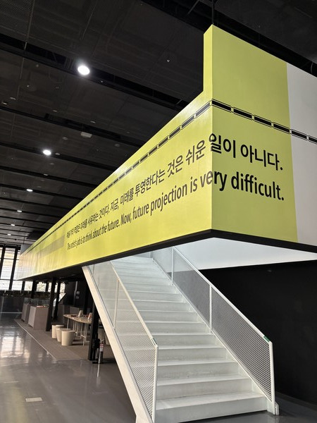 ◇ 이실아 : 네, 알겠습니다. 먼저 백남준아트센터에 가면 1층에 ‘예술가의 역할은 미래를 사유하는 것이다. 지금, 미래를 투영한다는 것은 쉬운 일이 아니다.’라고 문구가 크게 적혀 있습니다. 백남준은 예술가의 역할이 미래에 대한 사유에 있다고 보았던 것이죠.