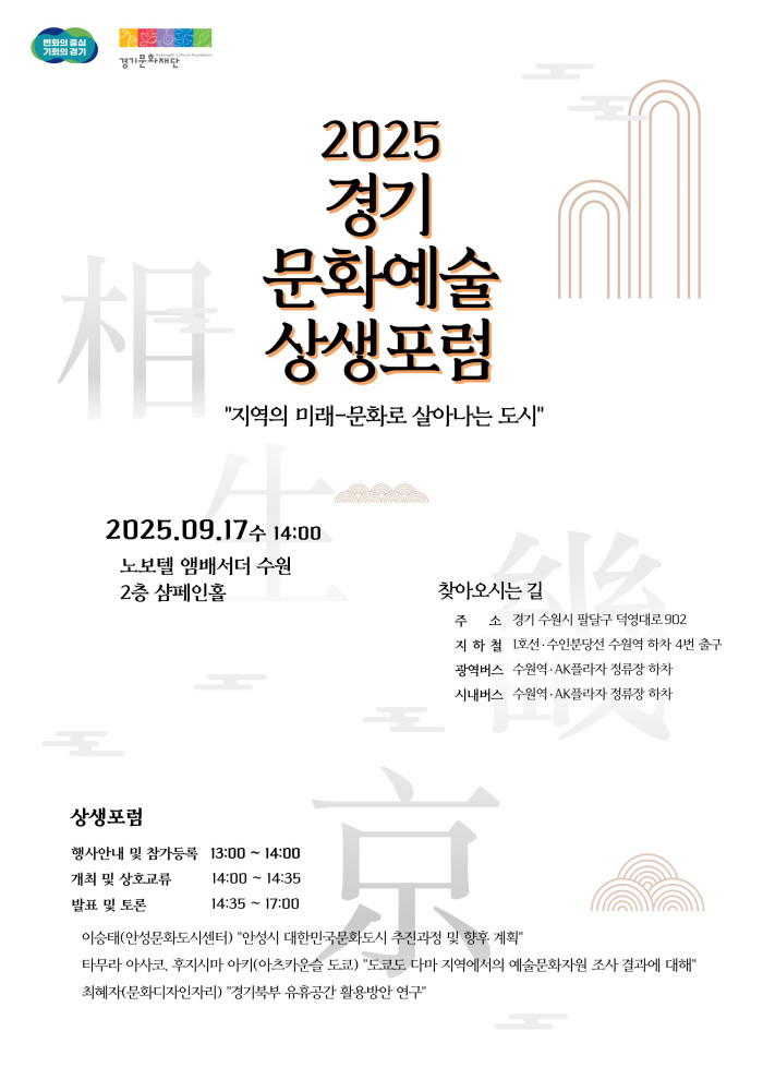 경기문화재단(대표이사 유정주)은 오는 9월 17일(수) 오후 2시, 노보텔 앰배서더 수원에서 ‘2025년 경기문화예술 상생포럼’을 개최한다.