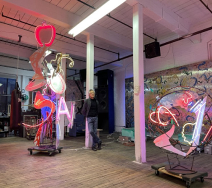 안형남, 이브와 아담(Eve and Adam), 2021, 알루미늄, 스테인리스 스틸, 네온 조명, 유화, 297x127x127cm(이브), 195.5x140x109cm(아담), 사진 출처: 워터폴 아트재단