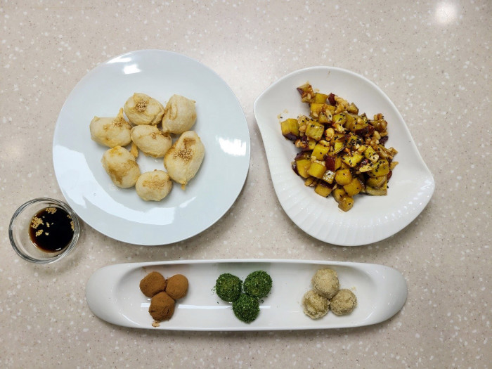 적문스님이 만든 토란튀김, 고구마견과류조림, 삼색경단