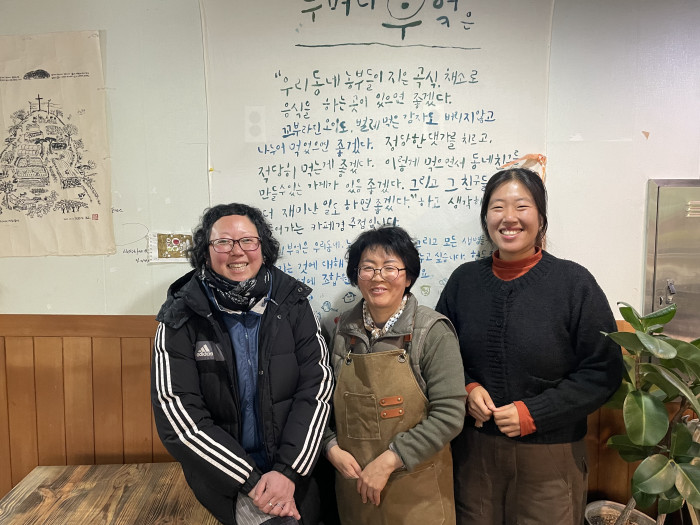 한여울 : 힘이 되는 이웃분들이 많죠. “이거 장아찌 담갔는데 갖다 쓸래?”하세요. 이런 것은 되게 조심스러운 부분이거든요. 간장이나 기름이나 식재료를 쓰는 기준이 있어서 민감한 부분이긴 한데 그분들이 어떤 분인지도 알잖아요. “이 장아찌는 내가 농사지어서 내가 담았어. 근데 이게 너무 많아서 부엌에 나눠주고 싶은데 부엌에서 쓸 수 있어?” 이러면 “잘 쓸게요.”하고 받을 수 있는 거죠. 김장 김치 같은 것도 “많이 남았어. 갖다 쓸래?” 이러시면 “네. 김치찌개 끓여먹을게요.”하고 받아오죠. 그분들은 자기 김장 김치를 본인들이 드시려고 담근 거잖아요. 고춧가루나 양념이나 다 농사지으신 걸로 하신 분들이고 국산 재료로 제대로 하신다는 걸 제가 아니까 부엌에 나눠주고 싶어하실 때 냉큼 받아올 수 있는 거죠.