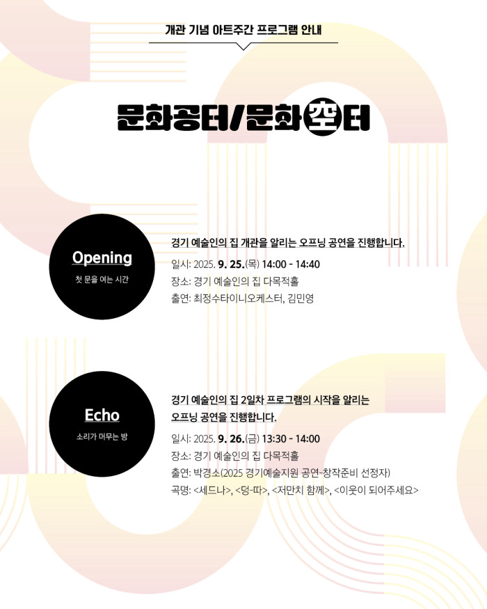 경기 예술인의 집 개관을 기념하여 풍성한 아트주간 프로그램이 펼쳐집니다. 다채로운 예술 프로그램 속으로 여러분을 초대합니다.