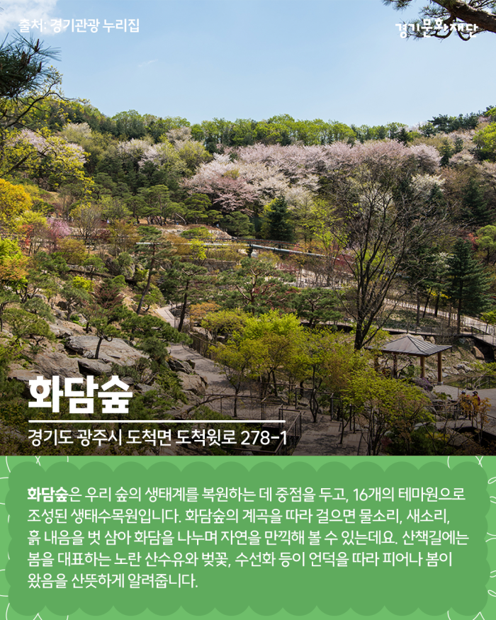 🌸경기도 광주시 도척면 도척윗로 278-1 화담숲은 우리 숲의 생태계를 복원하는 데 중점을 두고, 16개의 테마원으로 조성된 생태수목원입니다. 화담숲의 계곡을 따라 걸으면 물소리, 새소리, 흙 내음을 벗 삼아 화담을 나누며 자연을 만끽해 볼 수 있는데요. 산책길에는 봄을 대표하는 노란 산수유와 벚꽃, 수선화 등이 언덕을 따라 피어나 봄이 왔음을 산뜻하게 알려줍니다.
