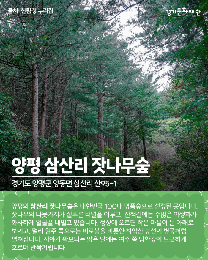 🌸경기도 양평군 양동면 삼산리 산95-1 양평의 삼산리 잣나무숲은 대한민국 100대 명품숲으로 선정된 곳입니다. 잣나무의 나뭇가지가 짙푸른 터널을 이루고, 산책길에는 수많은 야생화가 화사하게 얼굴을 내밀고 있습니다. 정상에 오르면 작은 마을이 눈 아래로 보이고, 멀리 원주 쪽으로는 비로봉을 비롯한 치악산 능선이 병풍처럼 펼쳐집니다. 시야가 확보되는 맑은 날에는 여주 쪽 남한강이 느긋하게 흐르며 반짝거립니다.