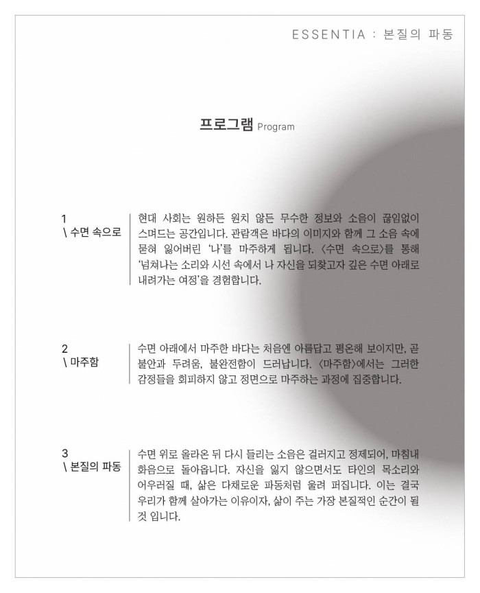 <ESSENTIA : 본질의 파동>은 음악과 영상, 그리고 스트링 콰르텟이 함께하는 전시형 공연입니다.