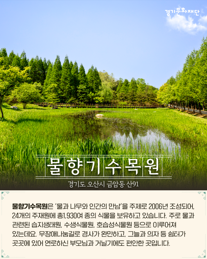 💐경기도 오산시 금암동 산91 물향기수목원은 ‘물과 나무와 인간의 만남’을 주제로 2006년 조성되어, 24개의 주재원에 총1,930여 종의 식물을 보유하고 있습니다. 주로 물과 관련된 습지생태원, 수생식물원, 호습성식물원 등으로 이루어져 있는데요. 무장애나눔길로 경사가 완만하고, 그늘과 의자 등 쉼터가 곳곳에 있어 연로하신 부모님과 거닐기에도 편안한 곳입니다.