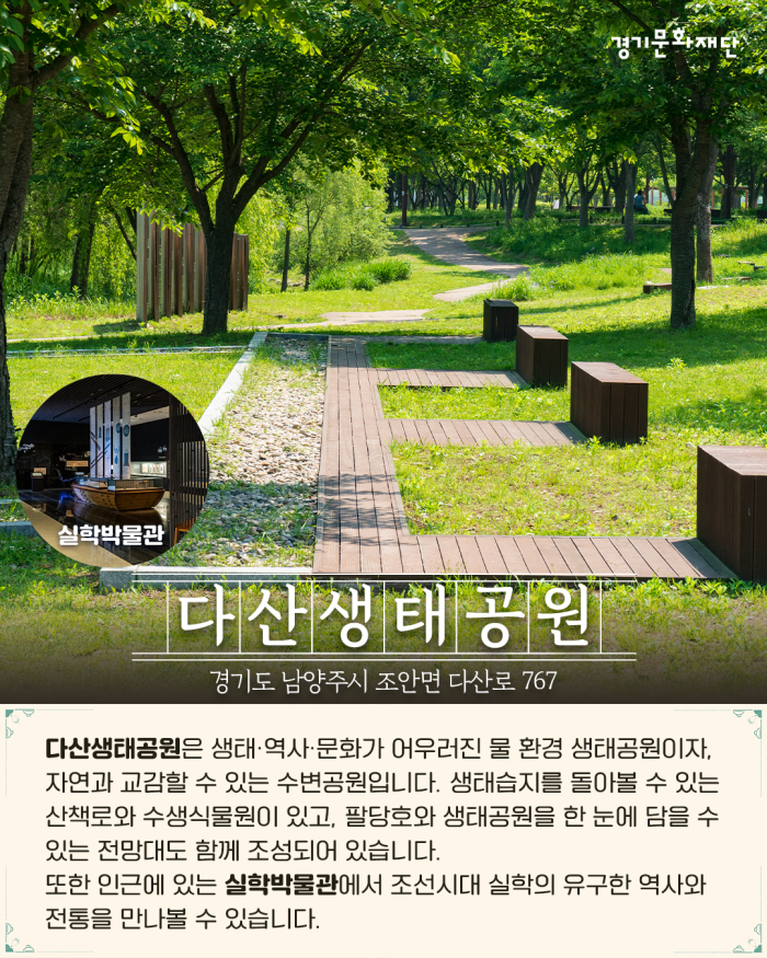 💐경기도 남양주시 조안면 다산로 767 다산생태공원은 생태·역사·문화가 어우러진 물 환경 생태공원이자, 자연과 교감할 수 있는 수변공원입니다. 생태습지를 돌아볼 수 있는 산책로와 수생식물원이 있고, 팔당호와 생태공원을 한 눈에 담을 수 있는 전망대도 함께 조성되어 있습니다. 또한 인근에 있는 실학박물관에서 조선시대 실학의 유구한 역사와 전통을 만나볼 수 있습니다.