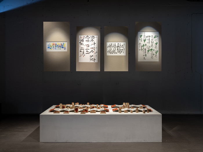 추사는 수많은 인장(도장)을 사용한 것으로도 유명하다. ‘김정희인’ ‘추사’ ‘완당’ ‘소봉래’ 등 200과가 넘는다. 아예 추사 인장 101과를 찍어 모아 놓은 ‘완당인보(阮堂印譜)’ 등 여러 인보까지 전해진다. ‘김정희 종가 유물’에도 추사의 인장 31과가 있다. 옛 서화가들에게 인장은 단순한 도장이 아니다. 돌이나 옥, 나무, 금속에 글자와 그림을 조각해 인장을 만드는 전각은 당당하게 ‘방촌(좁은 공간)의 예술’로 평가받았다. 인장은 실용품이기도 하지만 조각과 필력, 정신세계가 어우러져 좁은 공간에 밀도 높은 조형적 아름다움을 자아내는 예술품이었다. 그래픽디자인 스튜디오인 DDBBMM의 김강인·이윤호 작가는 추사의 인장을 주목해 추사가 신문물 고무도장을 접했다면 어땠을까 상상했다. 딱딱한 재료에 새기는 전각과 달리 고무도장은 더 유연한 표현이 가능하다. DDBBMM은 추사 작품들에서 문구를 발췌해 고무도장을 만들고 또 찍어냈다. 시서화에 인장까지 포함한 설치작품 ‘시서화인’은 색다르고 신선한 시각 체험을 선사한다.