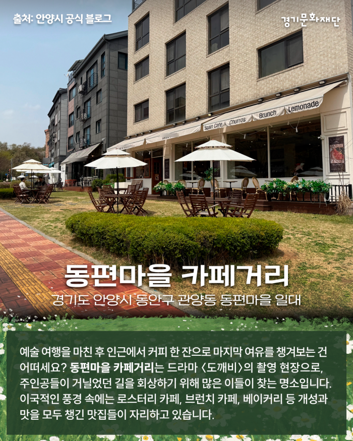 🎈경기도 안양시 동안구 관양동 동편마을 일대 예술 여행을 마친 후 인근에서 커피 한 잔으로 마지막 여유를 챙겨보는 건 어떠세요? 동편마을 카페거리는 드라마 〈도깨비〉의 촬영 현장으로, 주인공들이 거닐었던 길을 회상하기 위해 많은 이들이 찾는 명소입니다. 이국적이며 아름다운 풍경 속에는 로스터리 카페, 브런치 카페, 베이커리 등 개성과 맛을 모두 챙긴 맛집들이 자리하고 있습니다.