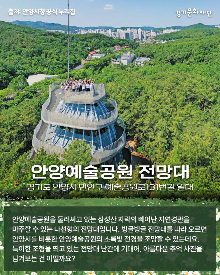 🎈경기도 안양시 만안구 예술공원로131번길 일대 안양예술공원을 둘러싸고 있는 삼성산 자락의 빼어난 자연경관을 마주할 수 있는 나선형의 전망대입니다. 빙글 빙글 전망대를 따라 오르면 안양시를 비롯한 안양예술공원의 초록빛 전경을 조망할 수 있는데요. 특이한 조형을 띄고 있는 전망대 난간에 기대어, 아름다운 추억 사진을 남겨보는 건 어떨까요?