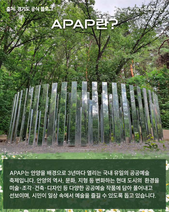 APAP는 안양을 배경으로 3년마다 열리는 국내 유일의 공공예술 축제입니다. 안양의 역사, 문화, 지형 등 변화하는 현대 도시의 환경을 미술·조각·건축·디자인 등 다양한 공공예술 작품에 담아 풀어내고 선보이며, 시민이 일상 속에서 예술을 즐길 수 있도록 돕고 있습니다.