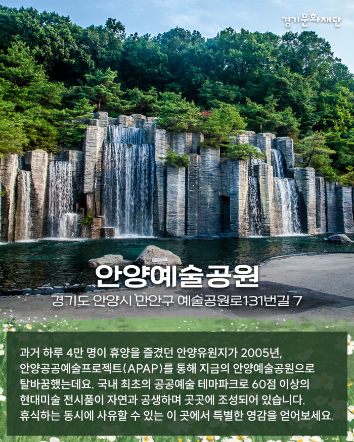 🎈경기도 안양시 만안구 예술공원로131번길 7 과거 하루 4만 명이 휴양을 즐겼던 안양유원지가 2005년, 안양공공예술프로젝트(APAP)를 통해 지금의 안양예술공원으로 탈바꿈했는데요. 국내 최초의 공공예술 테마파크로 60점 이상의 현대미술 전시품이 자연과 공생하며 곳곳에 조성되어 있습니다. 휴식하는 동시에 사유할 수 있는 이 곳에서 특별한 영감을 얻어보세요.