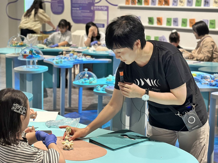황수경 작가의 ‘모두의 식탁’은 상반기에 진행한 작가 워크숍 ‘기이한 미래 식탁’의 연장선으로, ‘기이한 미래 식탁 2 : 꼬치-꼬치’라는 부제로 돌아왔다. 이번에는 상상 속 식재료를 비누로 만들어 꼬치에 꿰고 전시하는 활동으로, 단순한 제작을 넘어 ‘무엇을, 왜 만들었는가’라는 질문과 연결성에 집중한다. 어린이들은 수중 도시와 생태적 공존을 주제로 스스로 질문을 던지고 답을 찾아가며 자신만의 ‘생태 꼬치’를 완성한다. 완성된 창작물은 작가의 작업과 함께 ‘모두의 식탁’에 전시된다.
