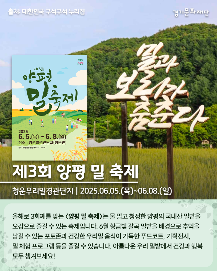 올해로 3회째를 맞는 〈양평 밀 축제〉는 물 맑고 청정한 양평의 국내산 밀밭을 오감으로 즐길 수 있는 축제입니다. 6월 황금빛 갈곡 밀밭을 배경으로 추억을 남길 수 있는 포토존과 건강한 우리밀 음식이 가득한 푸드코트, 기획전시, 밀 체험 프로그램 등을 즐길 수 있습니다. 아름다운 우리 밀밭에서 건강과 행복 모두 챙겨보세요!