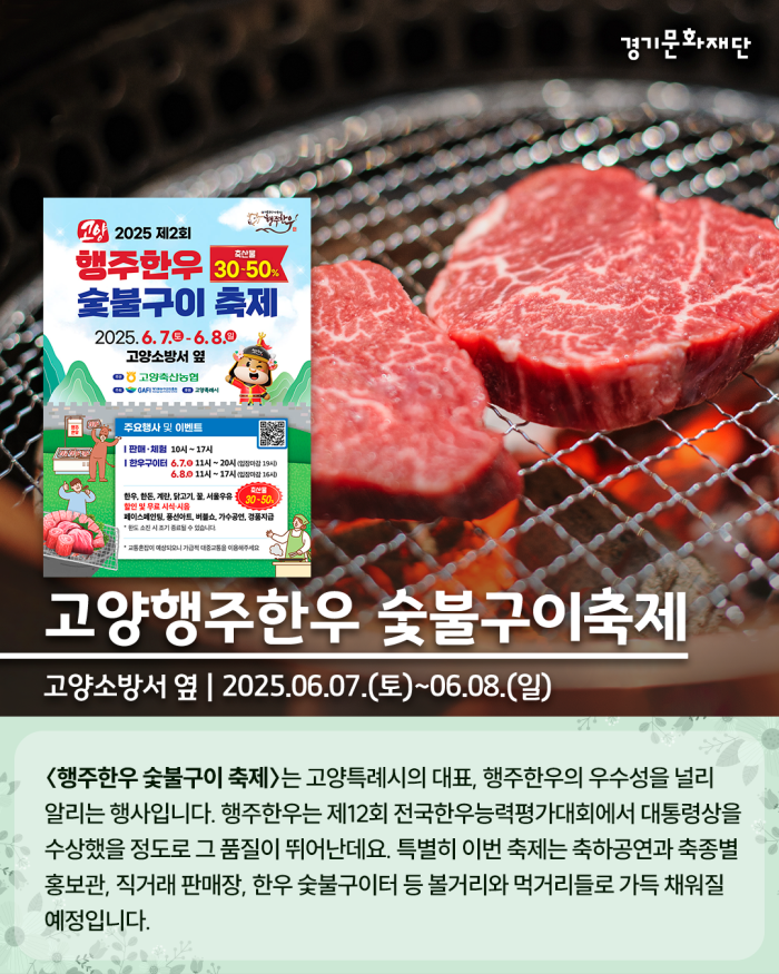 〈행주한우 숯불구이 축제〉는 고양특례시의 대표, 행주한우의 우수성을 널리 알리는 행사입니다. 행주한우는 제12회 전국한우능력평가대회에서 대통령상을 수상했을 정도로 그 품질이 뛰어난데요. 특별히 이번 축제는 축하공연과 축종별 홍보관, 직거래 판매장, 한우 숯불구이터 등 볼거리와 먹거리들로 가득 채워질 예정입니다.