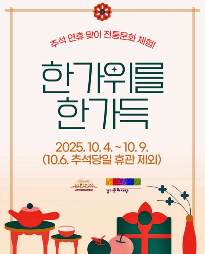 남한산성역사문화관은 추석 연휴를 맞아 전통문화를 체험할 수 있는 특별 행사 ‘한가위를 한가득’을 운영한다. 이번 행사는 추석 당일인 10월 6일(월)을 제외하고, 10월 4일(토)부터 9일(목)까지, 총 5일간 진행된다. 행사 기간 동안 관람객들은 가족과 함께 ▲윷놀이 ▲투호 ▲제기차기 등 전통 민속놀이를 즐길 수 있으며, 추억을 남길 수 있는 추석 포토존과 자율체험 학습지 활동 ‘이서 장군의 무기노트를 찾아라’, ‘지수당 무드등 그리기’ 프로그램도 상시 체험할 수 있다.