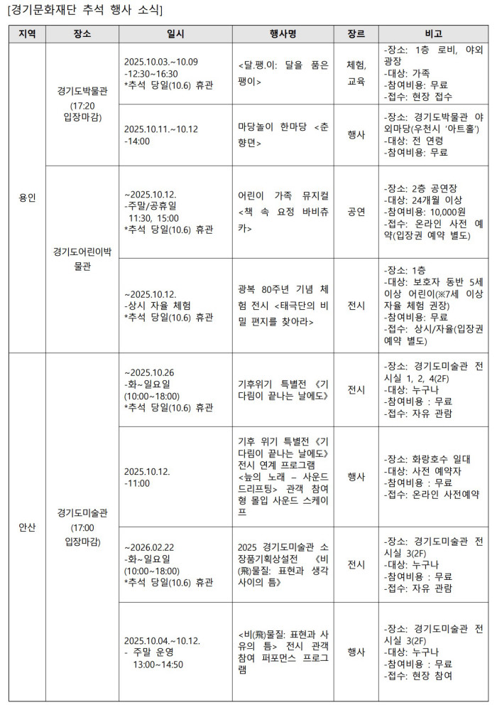 ▶ 경기문화재단, 도내 9개 문화시설에서 만나는 풍성한 한가위 문화·예술 한마당 마련