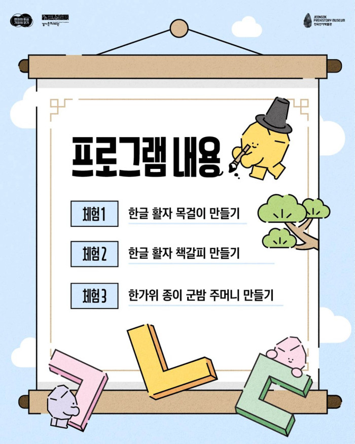 이뿐만 아니라, 추석 연휴와 이어지는 한글날 기간(10월 7일~10일)에는 특별 체험교육 프로그램 ‘세종대왕 전곡오심’을 선보인다. 7일부터 10일까지는 세종대왕의 한글 창제와 금속활자의 의미를 되새기며 3D펜으로 금속활자 모형과 목걸이를 제작하고, 금속활자 낱말도 만들어보는 ‘한글 활자 목걸이 만들기’가 진행된다. 또한 7일부터 9일까지는 한글 및 선사문양 스탬프로 나만의 책갈피를 꾸며보는 ‘한글활자 책갈피 만들기’와 명절의 정취를 담은 ‘한가위 종이 군밤 주머니 만들기’ 체험도 함께 운영된다.