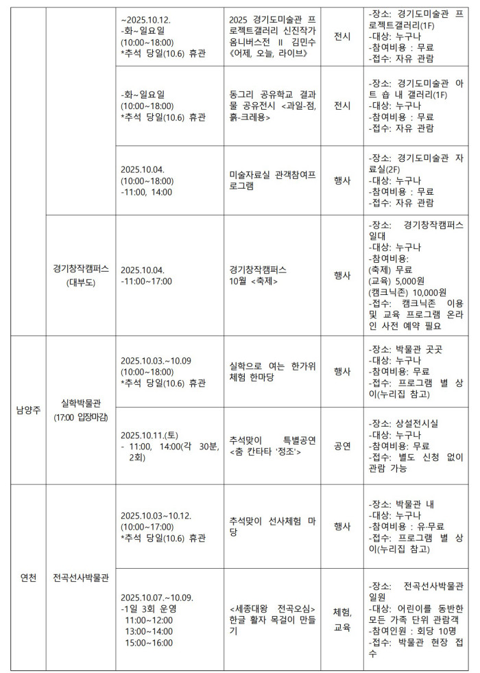 경기문화재단(대표 유정주)은 다가오는 추석 연휴에도 도민과 방문객들이 문화와 함께하는 시간을 보낼 수 있도록 도내 9개 문화시설에서 다채로운 프로그램을 운영한다. 경기도박물관(용인), 경기도어린이박물관(용인), 경기도미술관(안산), 경기창작캠퍼스(안산 대부도), 실학박물관(남양주), 경기북부어린이박물관(동두천), 전곡선사박물관(연천), 남한산성역사문화관(광주), 경기상상캠퍼스(수원) 등의 기관을 통해 전통문화를 경험하고, 여유로운 전시 감상과 다채로운 공연을 즐기며 풍성한 연휴의 의미를 더할 수 있다. 추석 당일을 제외한 연휴 동안 경기문화재단 문화시설의 문은 활짝 열려 있어, 남녀노소 누구나 가까운 곳에서 문화를 접하고, 새로운 활력을 얻을 수 있다.
