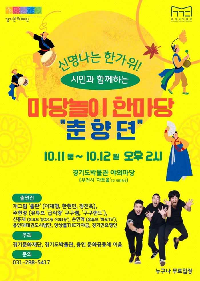 또한, 10월 11일(토)과 12일(일) 오후 2시에는 경기도박물관 야외마당에서 시민과 함께하는 마당놀이 한마당 ‘춘향뎐’이 펼쳐진다. 전통 마당놀이와 현대 개그가 결합한 이번 공연은 남녀노소 누구나 관람할 수 있어 가족 단위 관람객들에게 즐거운 시간을 선사한다. 더불어 용인대 태권도 시범단의 역동적인 공연도 함께 마련되어 풍성한 볼거리를 더할 예정이다.