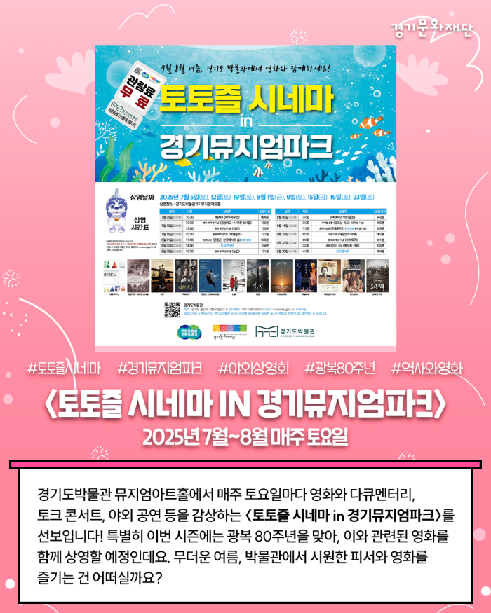 경기도박물관 뮤지엄아트홀에서 매주 토요일마다 영화와 다큐멘터리, 토크 콘서트, 야외 공연 등을 감상하는 〈토토즐 시네마 in 경기뮤지엄파크〉를 선보입니다! 특별히 이번 시즌에는 광복 80주년을 맞아, 이와 관련된 영화를 함께 상영할 예정인데요. 무더운 여름, 박물관에서 시원한 피서와 영화를 즐기는 건 어떠실까요?