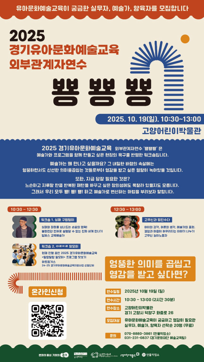 〈2025 경기 영아 문화예술 주간〉의 모든 프로그램은 무료로 진행되며, 자세한 일정 및 예약 방법은 각 기관의 누리집을 참고하면 된다. 한편, 오는 19일 고양어린이박물관과 협력하여 진행되는〈2025 경기 유아 문화예술교육 외부 관계자 연수〉“뿅뿅뿅”은 어른에게는 가깝지만 낯선 세계인 ‘유아 문화예술교육’을 깊이 탐구하고 함께 고민하기 위해 기획되었다.