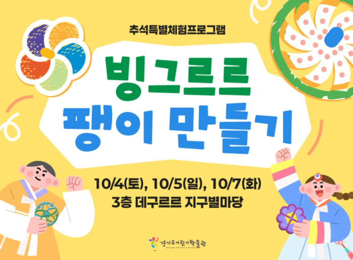 10월 4일(토), 5일(일), 7일(화)에는〈빙그르르 팽이 만들기〉프로그램이 운영된다. 우리나라 전통놀이인 팽이를 만들어보는 자율 체험 프로그램으로 오전 11:00~12:00, 오후 3:00~4:00(단, 4일(토)에는 오후 12:00~1:00, 오후 4:00~5:00 운영) 동안 운영되며, 체험 시간은 약 10분 정도 소요된다. 현장 접수로 참여 가능하며, 잔여석이 생길 때마다 선착순으로 입장한다. 프로그램에 관한 자세한 내용은 경기도어린이박물관 누리집에서 자세히 확인할 수 있다.
