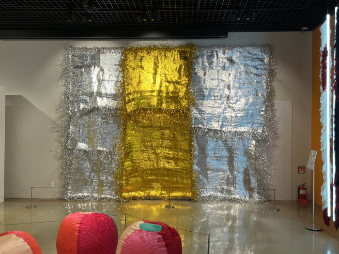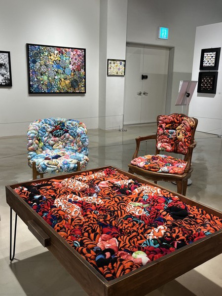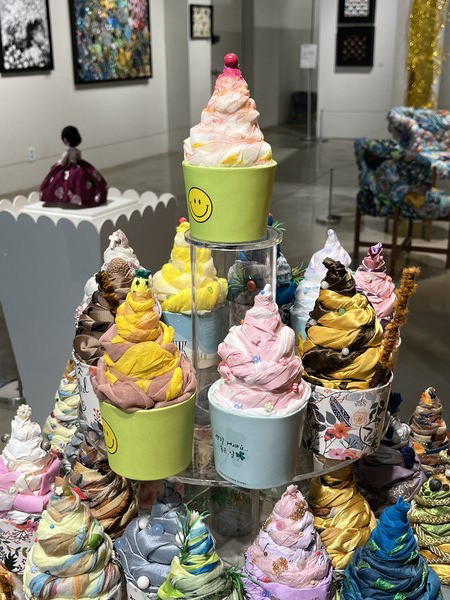 ◇ 이실아 : 맞습니다. 그리고 흔히 몸빼바지라고 부르는 편한 일바지나 보자기 같은 의류가 재료로 쓰인 작품도 눈에 들어왔는데요. 화려한 페이즐리 무늬나 패턴이 많은데 그런 익숙한 소재들이 작품 속에서 컵케이크나 가구로 특별하게 변신한 걸 보니까 신기하고 재밌었어요.