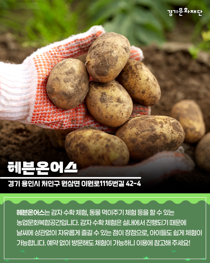 헤븐온어스는 감자 수확 체험, 동물 먹이주기 체험 등을 할 수 있는 농업문화복합공간입니다. 감자 수확 체험은 실내에서 진행되기 때문에 날씨에 상관없이 자유롭게 즐길 수 있는 점이 장점으로, 아이들도 쉽게 체험이 가능합니다. 예약 없이 방문해도 체험이 가능하니 이용에 참고해 주세요!