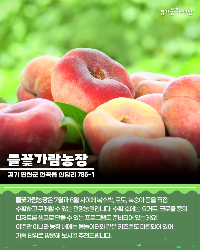 들꽃가람농장은 7월과 8월 사이에 복수박, 포도, 복숭아 등을 직접 수확하고 구매할 수 있는 관광농원입니다. 수확 후에는 요거트, 크로플 등의 디저트를 셀프로 만들 수 있는 프로그램도 준비되어 있는데요! 이뿐만 아니라 농장 내에는 물놀이터와 같은 키즈존도 마련되어 있어 가족 단위로 방문해 보시길 추천드립니다.