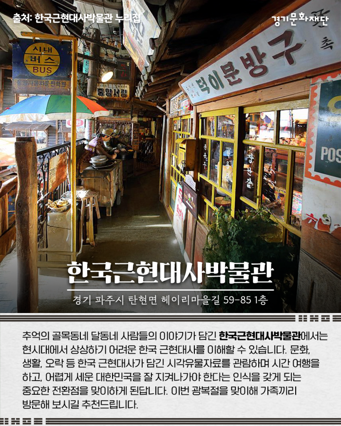 추억의 골목동네 달동네 사람들의 이야기가 담긴 한국근현대사박물관에서는 현시대에서 상상하기 어려운 한국 근현대사를 이해할 수 있습니다. 문화, 생활, 오락 등 한국 근현대사가 담긴 시각유물자료를 관람하며 시간 여행을 하고, 어렵게 세운 대한민국을 잘 지켜나가야 한다는 인식을 갖게 되는 중요한 전환점을 맞이하게 된답니다. 이번 광복절을 맞이해 가족끼리 방문해 보시길 추천드립니다.