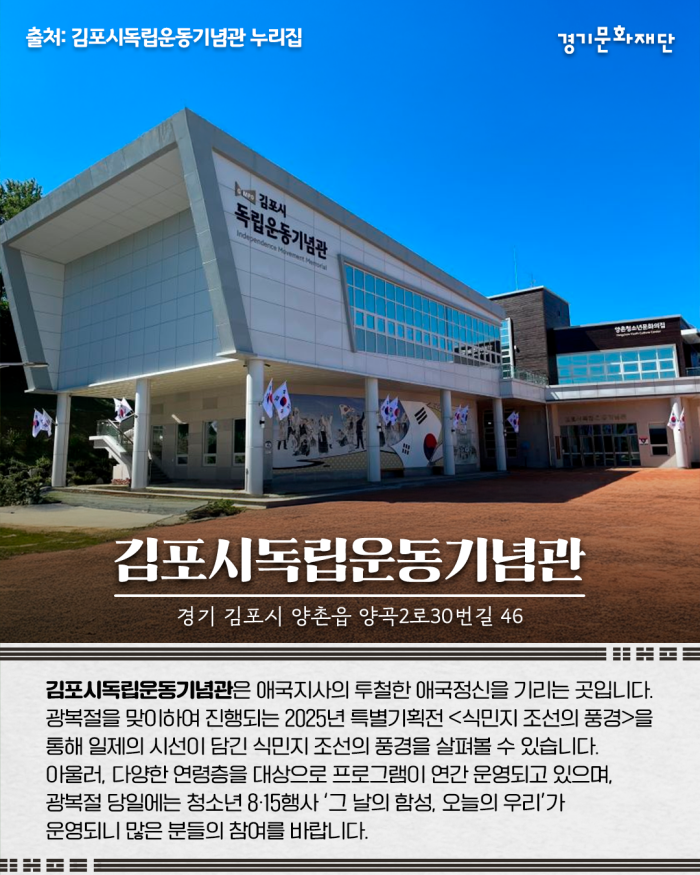 김포시독립운동기념관은 애국지사의 투철한 애국정신을 기리는 곳입니다. 광복절을 맞이하여 진행되는 2025년 특별기획전 <식민지 조선의 풍경>을 통해 일제의 시선이 담긴 식민지 조선의 풍경을 살펴볼 수 있습니다. 아울러, 다양한 연령층을 대상으로 프로그램이 연간 운영되고 있으며, 광복절 당일에는 청소년 8·15행사 ‘그 날의 함성, 오늘의 우리’가 운영되니 많은 분들의 참여를 바랍니다.