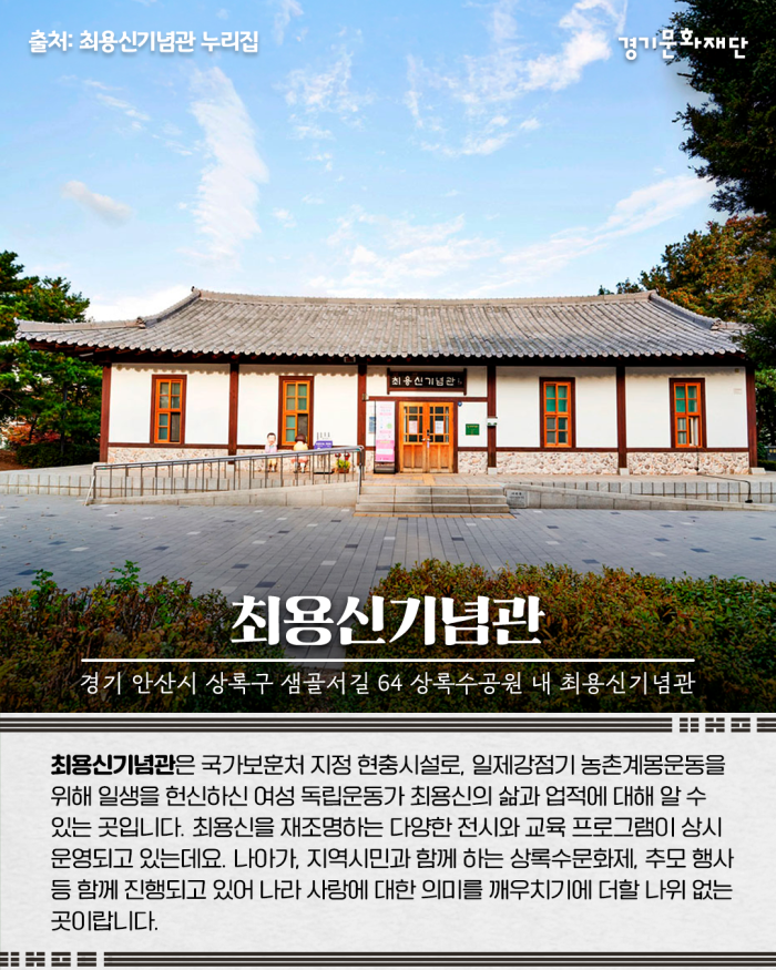 최용신기념관은 국가보훈처 지정 현충시설로, 일제강점기 농촌계몽운동을 위해 일생을 헌신하신 여성 독립운동가 최용신의 삶과 업적에 대해 알 수 있는 곳입니다. 최용신을 재조명하는 다양한 전시와 교육 프로그램이 상시 운영되고 있는데요. 나아가, 지역시민과 함께 하는 상록수문화제, 추모 행사 등 함께 진행되고 있어 나라 사랑에 대한 의미를 깨우치기에 더할 나위 없는 곳이랍니다.
