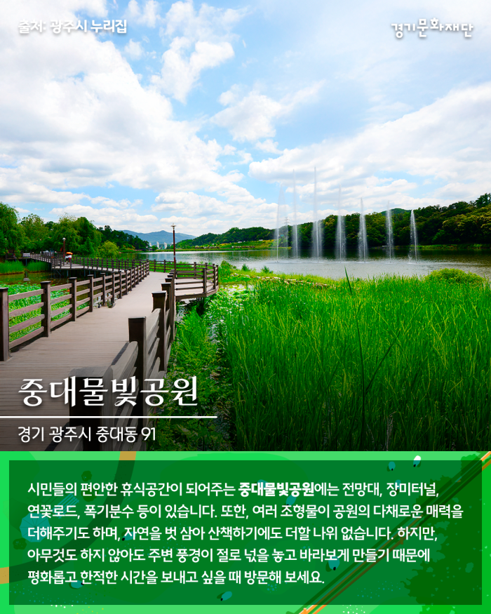 시민들의 편안한 휴식공간이 되어주는 중대물빛공원에는 전망대, 장미터널, 연꽃로드, 폭기분수 등이 있습니다. 또한, 여러 조형물이 공원의 다채로운 매력을 더해주기도 하며, 자연을 벗 삼아 산책하기에도 더할 나위 없습니다. 하지만, 아무것도 하지 않아도 주변 풍경이 절로 넋을 놓고 바라보게 만들기 때문에 평화롭고 한적한 시간을 보내고 싶을 때 방문해 보세요.